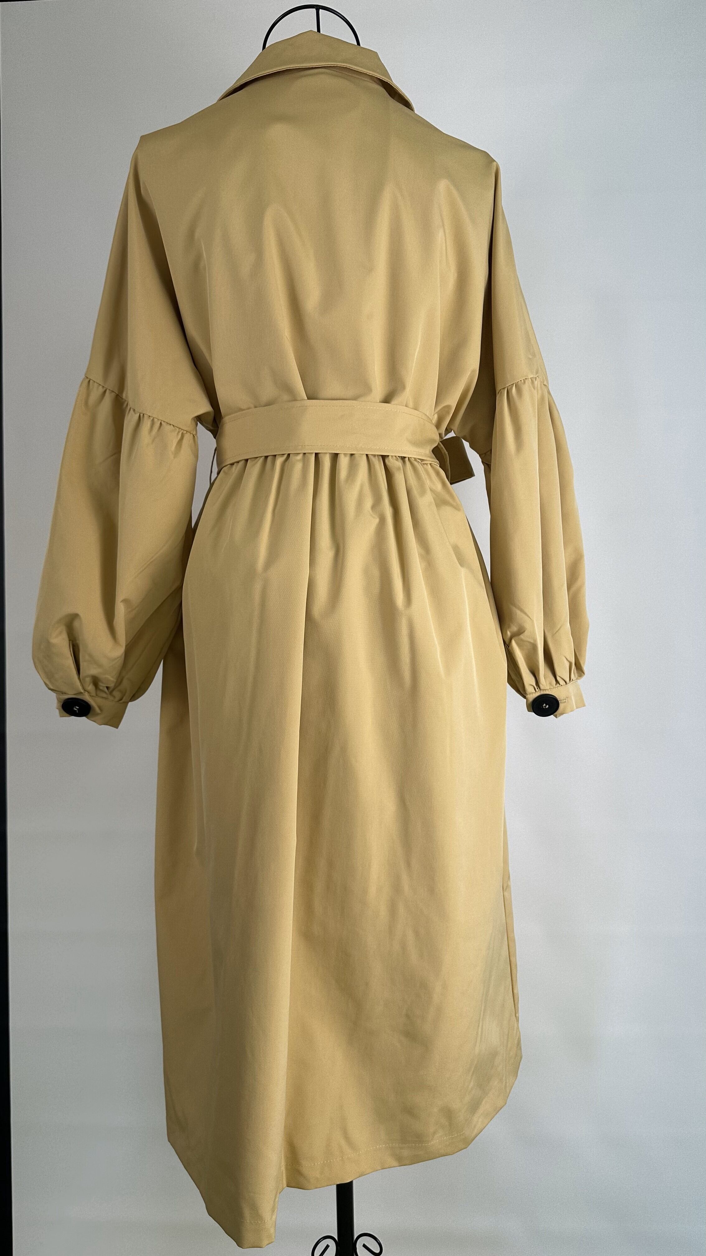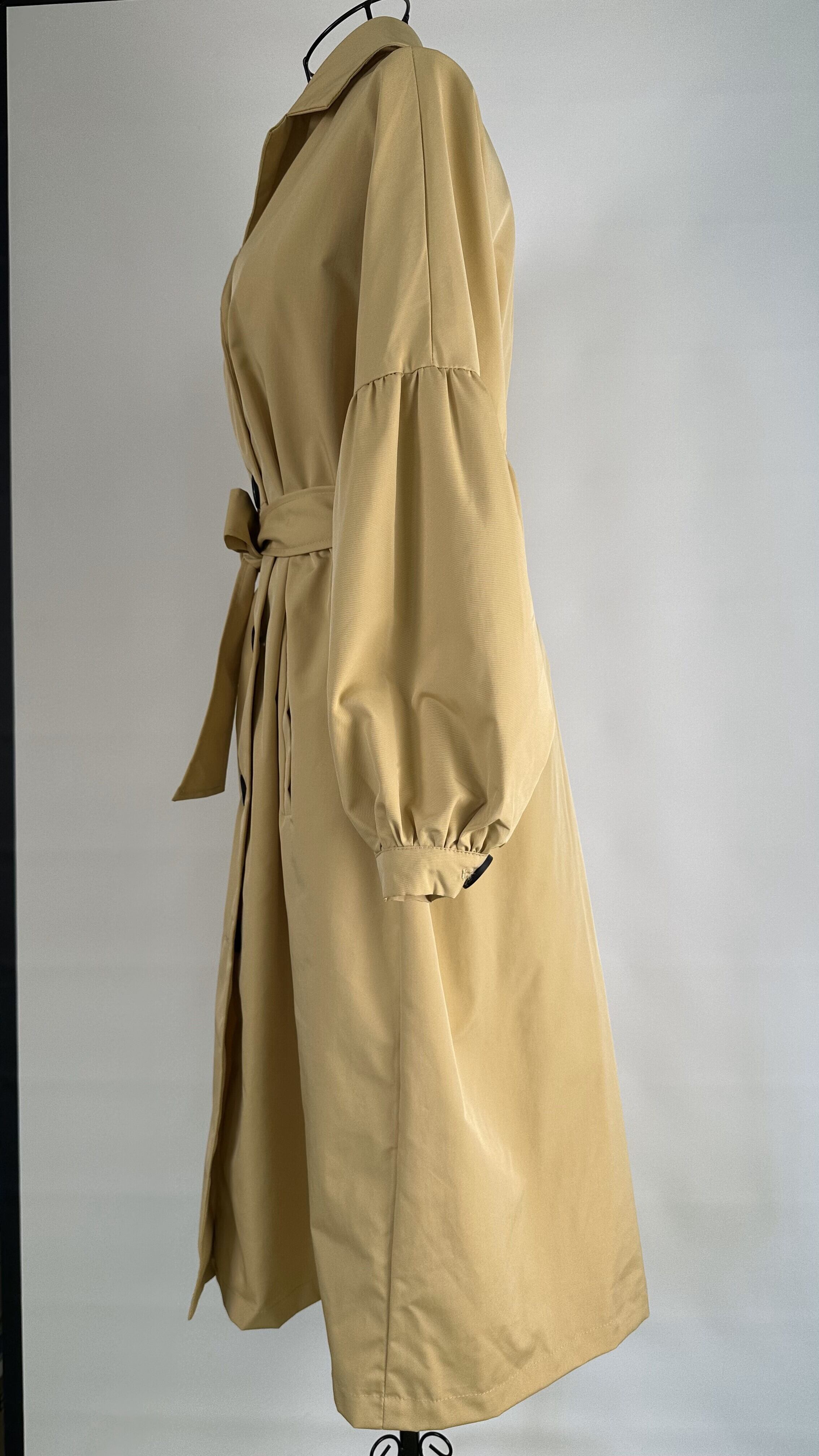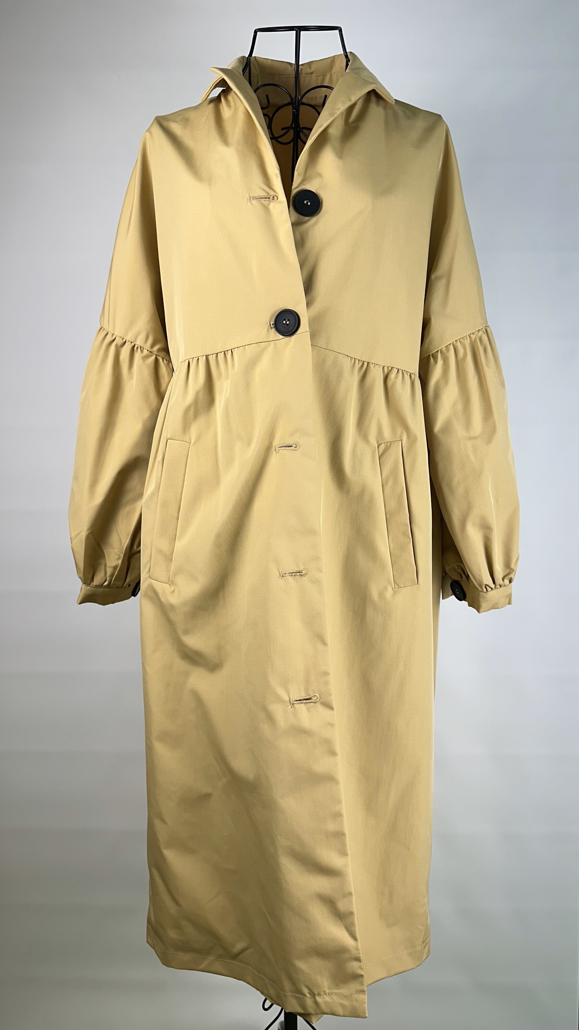 ベージュのスプリングコート。バストと袖に切替があり、切替えギャザーで、ふんわりとしたスタイルがガーリッシュでカワイイ!