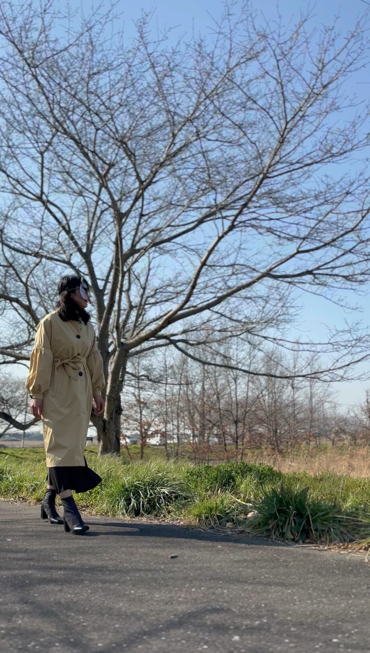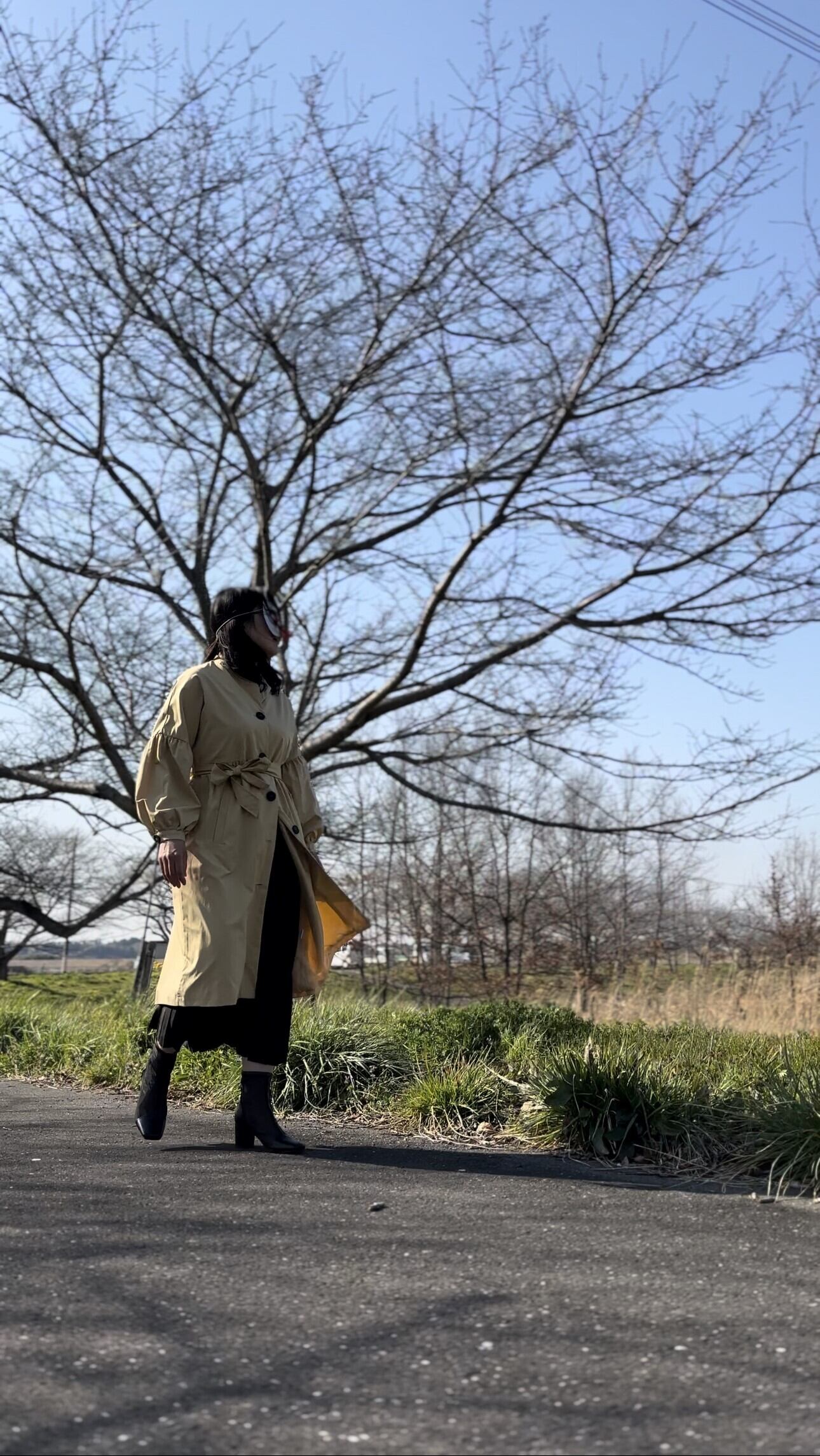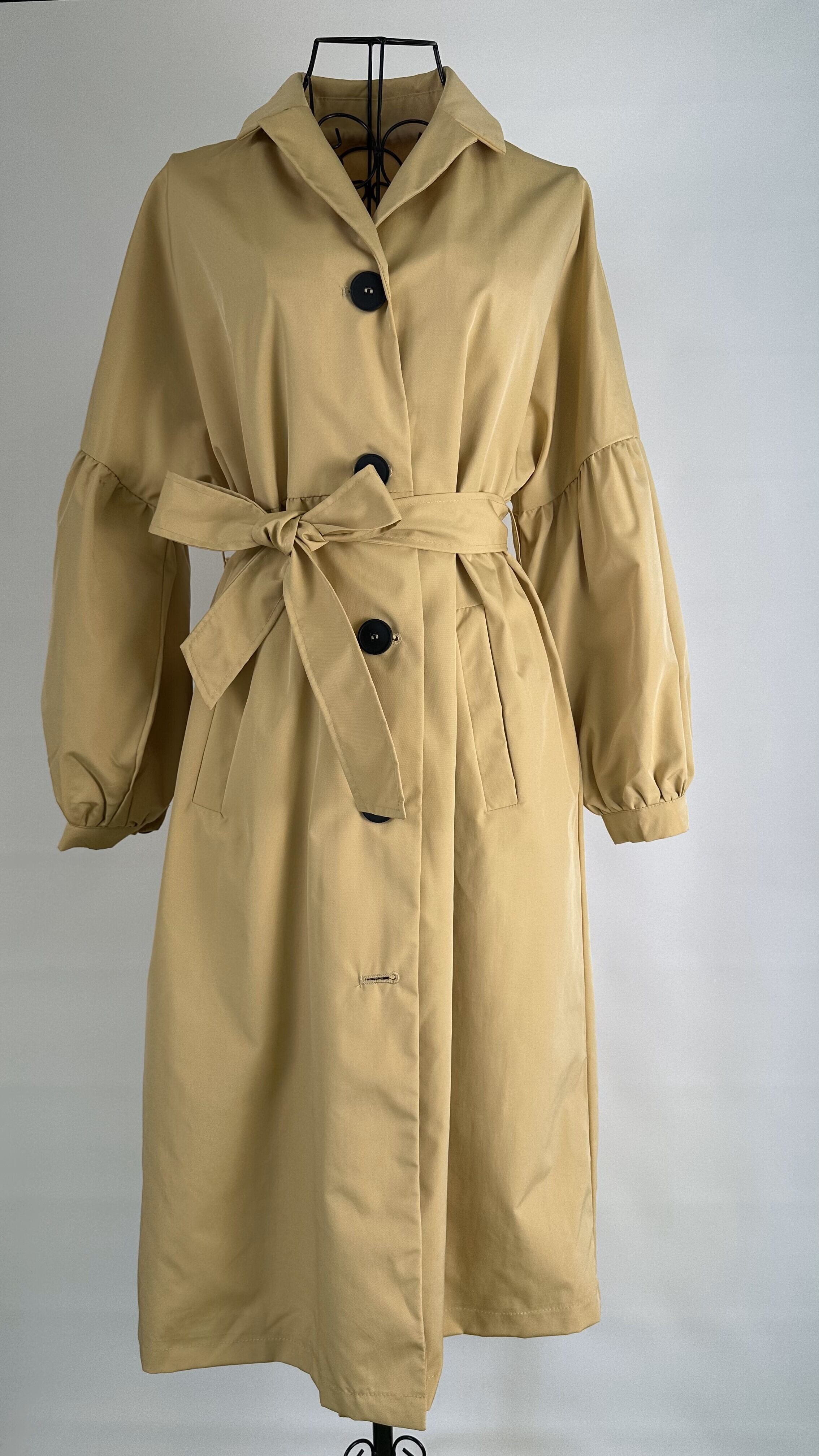 ベージュのスプリングコート。バストと袖に切替があり、切替えギャザーで、ふんわりとしたスタイルがガーリッシュでカワイイ!
