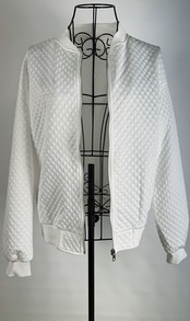 キルティングのようなテクスチャードされた白いジップアップブルゾン。春夏秋3シーズン着用できるアウター。カジュアルはもちろん、ワンピースなどオシャレコーデにもOK!